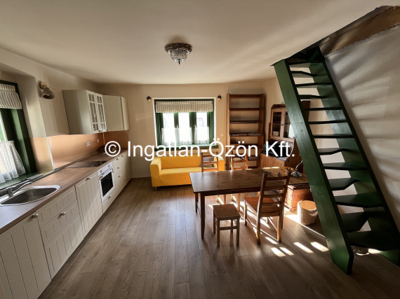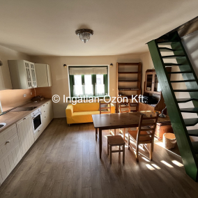 Elrendezés: Alsó szinten 21,6 m2-en amerikai konyha, nappali és kis wc-kézmosó. Az emeleten, amely bruttó 29,5 m2 (nettó 13 m2) hálószoba, és fürdőszoba.
